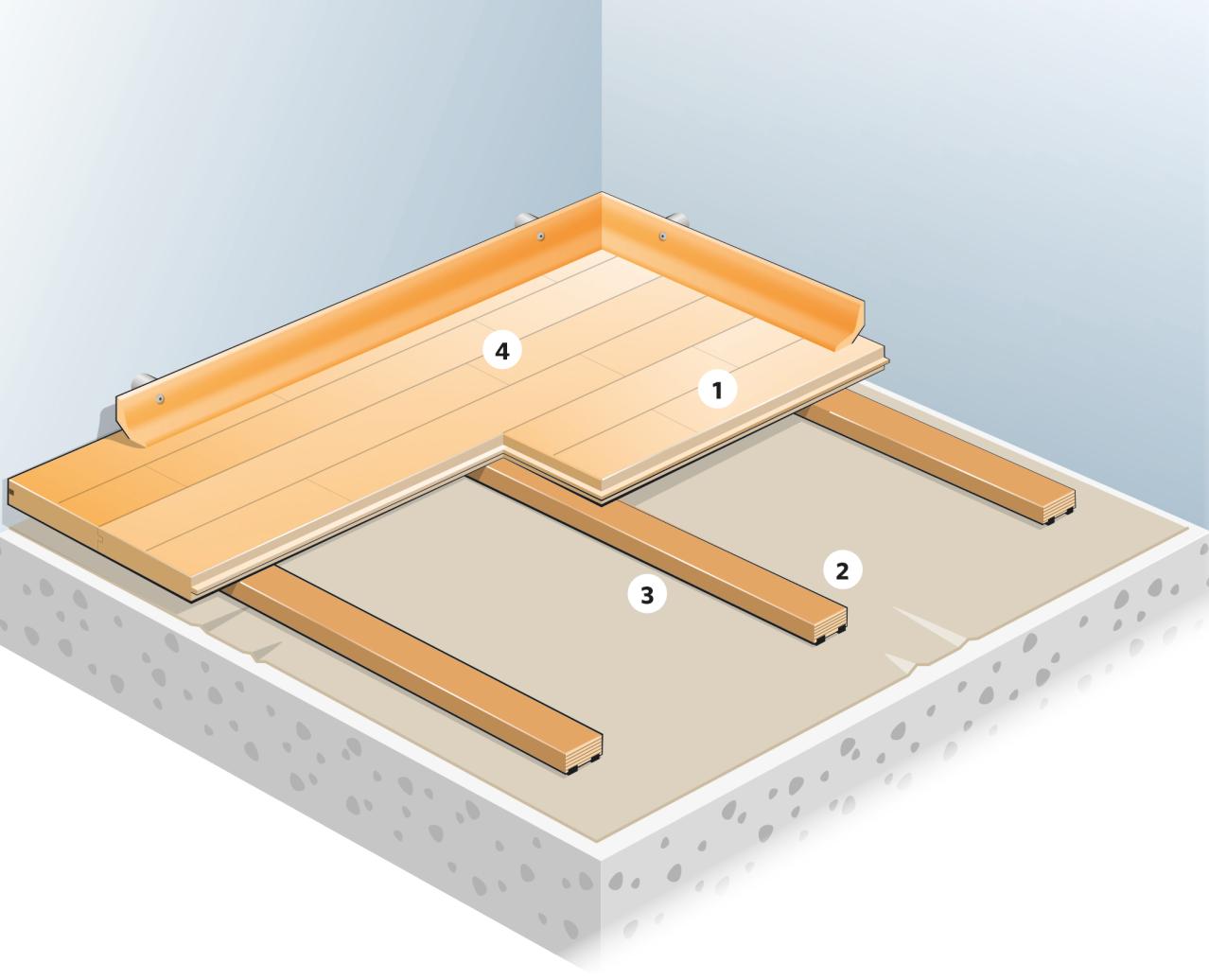 As tábuas para assoalho de madeira maciça são pregadas a um alicerce resiliente construído com uma camada de sarrafos projetados com um arranjo único de tiras de borracha especialmente desenvolvidas e pré-instaladas na parte inferior dos sarrafos.